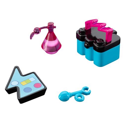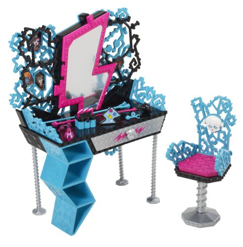 The ghouls of Monster High each have their beautifying routines to ensure they always look fierce. Frankie Stein loves to get ready to go out at her striking vanity. Seated in her chair before the opening mirror, she can style her hair with the hair dryer, apply makeup using the palette and wrench makeup brush, get energized with a charging cord and battery train case and add her signature scent from the beaker perfume. A drawer and shelves give her plenty of room to work, while photo stickers let girls decorate to suit their style.Feature