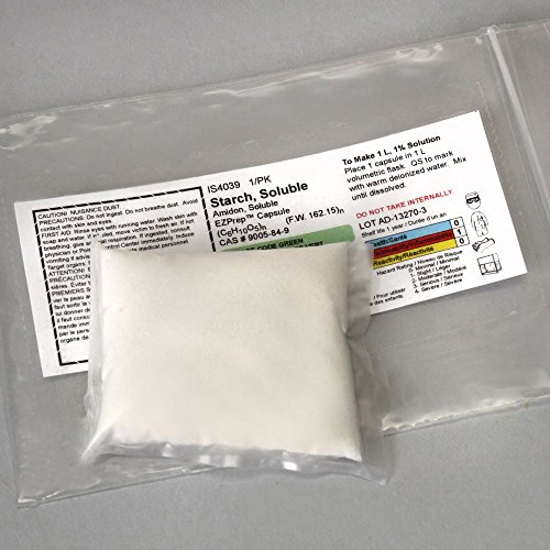 Formula: (C6H10O5)n F.W.: (162.15)n CAS No.: 9005-84-9 Health Risk: 0 Flammability: 1 Reactivity: 0 Notes: Each Large Starch ChemCapsule makes 1 L of 1% starch solution. Place 1 ChemCapsule in a 1-L volumetric flask. Dilute to mark with warm deionized water and mix until dissolved. PVA bag dissolves in solution. This product is specially made for use in science education laboratories; no certificate of analysis is available. 0 |