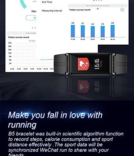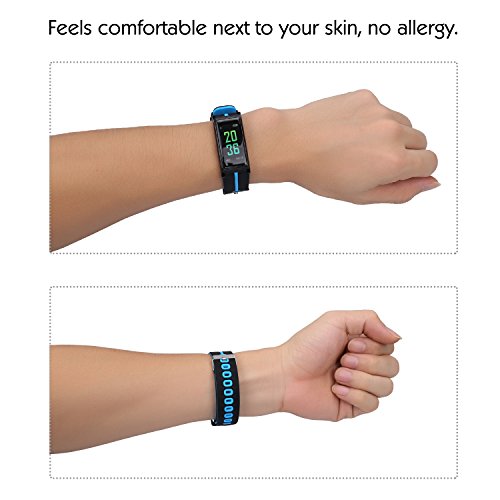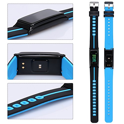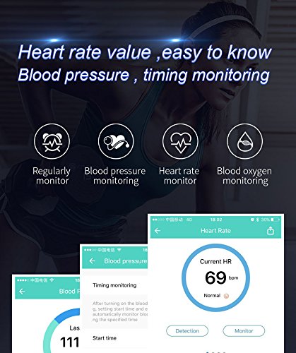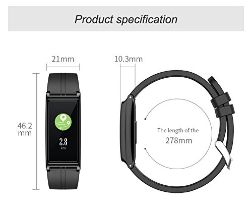 -. Feature : 【WIDE COMPATIBILITY】The app supports most smart phones with Bluetooth 4.0. Support system: iOS 7.1 or above (iPhone 4S, iPhone 5/5S/5C, iPhone 6/6S plus, iPhone 7/7S plus, etc.), Android 4.4 or above (Huawei Mate 7/P9, LG, Samsung, etc ).If for any reason you are not satisfied, please feel free to contact us via" Help Desk" on Amazon Messaging Services for all your issues,We will help you solve the problem quickly.) / 【Fitness Tracker】 Heart Rate Monitor,Blood pressure monitor, Blood oxygen monitor,Date/Time display,Pedometer,Distance,Calories,Sleep Monitor,Daily Reminder,Regularly monitor,when you do exercise to help you achieve fitness goals.Action tracker can not only record all the daily life,but also allows you to not miss any important things,rest time,notes,rest,medication,eating,calendar, keep your body at any time control. / 【HD Full Color Screen and Band Size】16 million full color high-definition TFT-LCD touch screen display,to bring you the ultimate visual experience and touch experience. The band size fit for wrist from 6'' to 8.7'', it's also be a best choice for Valentine's Day/Birthday/Father's Day/Graduation gift. / 【Turn On and Fast Charge】First time use,Long press the touch key below the screen to turn on bracelet.If the screen can not be turn on,charge it for 2-3hours,then try to re-start it up.Charge methods--①.Find the charging touch spots at the back of the bracelet;②.Make the pins of clip charger aim at the touch spots and clamp the bracelet,USB and plug into computer USB port to charge.(NOTE:The charger must clampe the bracelet tightly,otherwise you may fail to charge.) / 【IP67 grade waterproof】Great IP67 high dust-proof and waterproof design. Dustproof grade 6 is the highest class performance, and it is complete dustproof structure. Waterproof grade 7 means it will be safe even if it is submerged in water 15 cm to 1 m for 30 minutes. It is not necessary to remove it when washing your hands or washing others everyday life. We also support sweat, rain, splashed water.(Please noted: Only be used in Cold water, do NOT use it in Hot water,otherwise it will be damage