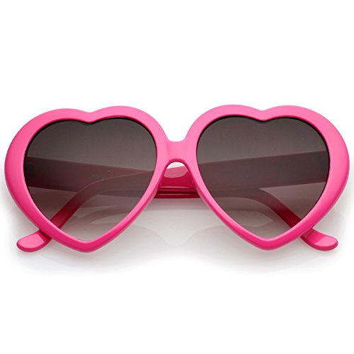 Sweet and cute, these heart-shaped sunglasses feature are designed in a variety of fun colors and an oversized silhouette. Accented with stylishly wide temples and neutral-colored gradient lenses, these darling sunglasses add a flirty touch to any look. Perfect for parties, music festivals, or Springtime, we are falling in love with these heart sunglasses. Made with a plastic based frame, metal hinges, and polycarbonate UV400 lenses. Lens Height: 50 mm | Lens Width: 55 mm | Bridge: 16 mm | Frame Total: 142 mmFeature