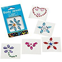 Plastic Deluxe Body Jewels. Assorted styles. Easy to apply and remove. (1 pc./card) 1 1/2" - 2". Dozen cards per set. Set includes a dozen assorted body jewels. Fun party favor or costume accessory.