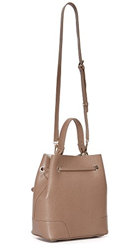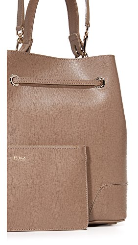 A petite Furla bucket bag in glossy, textured leather. Polished hardware and logo detailing. A drawstring opens the top, and the suede interior contains a tethered, detachable zip pouch. Slim top handle and optional, adjustable shoulder strap. Dust bag included.Feature