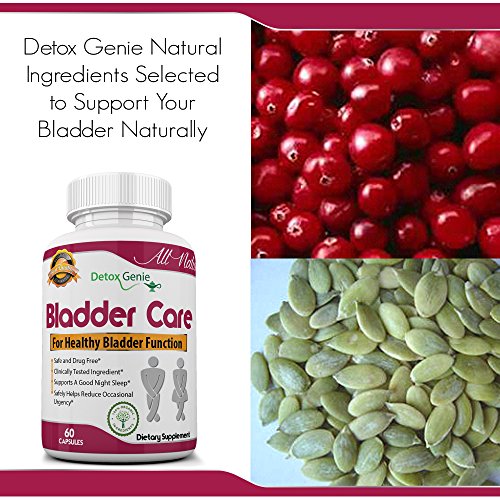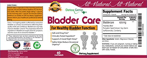 -. Binding : Health and Beauty -. Brand : Detox Genie -. Color : white -. EAN : 0646437149556 -. Feature : Patented Ingredients Clinically proven formulation to target both the symp and causes of incontinence and overactive Bladder. Patients showed positive results within a week of use. / Pumpkin Seeds support, strengthen, maintain bladder muscles and make weak pelvic floor muscles stronger to better control urine flow. Get post pregnancy pee control back. Support prostate health. No more embarrassing leaks or involuntary loss of bladder control. / Cranberry super-fruit promotes bladder health and prevent urinary tract infections by keeping UTIs at bay. / Regain your confidence and social life. Start enjoying physical activities again. Sleep through the night. / 100% Pure Natural Ingredients made right here in the USA. FDA & GMP Certified. No additives or binders, GMO and Gluten Free, Kosher & Halal certified. -. IsAdultProduct : 0 -. Label : Detox Genie -. LegalDisclaimer : Directions: ADULTS take 2 capsules in the morning and two capsules 30 minutes before bedtime for the first two weeks. After two weeks, begin taking 1 capsule in the morning and 1 capsule 30 minutes before bedtime or as needed. As with any dietary supplement please inform your healthcare professional before taking. WARNING: If you are pregnant or nursing or taking any other medication please contact your health professional before use. Keep out of the reach of children. Store in a cool dry place. Ingredients: Pumpkin Seed, Cranberry, Soy Germ Isoflavonoids, Gelatin (Kosher & Halal certified), Magnesium Stearate and Silica. -. Manufacturer : Detox Genie -. PackageQuantity : 1 -. ProductGroup : Health and Beauty -. ProductTypeName : HEALTH_PERSONAL_CARE -. Publisher : Detox Genie -. Size : Small -. Studio : Detox Genie -. Title : Bladder Care Supplement with Pumpkin Seed Extract, Cranberry & Soy Germ Isoflavonoids Men & Women -. UPC : 646437149556