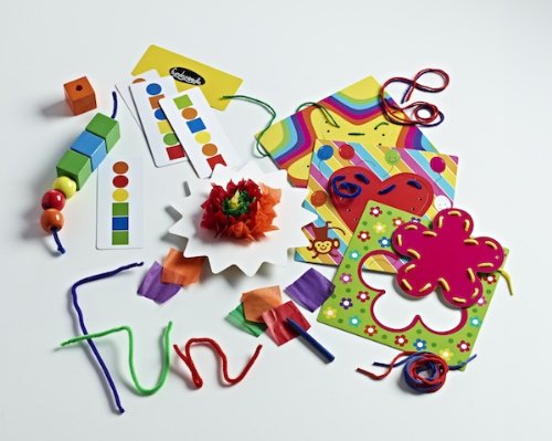 - Feature : Promotes manual dexterity, body perception, color and shape recognition, exploration of touch / Kit includes 3 assorted lacing/tracing cards, 10 assorted shaped cards, 100 assorted color tissue paper squares, 12 pipe cleaners, 3 shoe laces, 3 strands of yarn, 5 beading pattern cards, 20 wooden beads / Varying degrees of difficulty within the activities allow for progression / Children have fun and learn quickly / Handy carrying case makes this kit perfect for use at home or on-the-go
