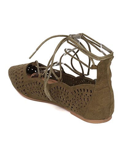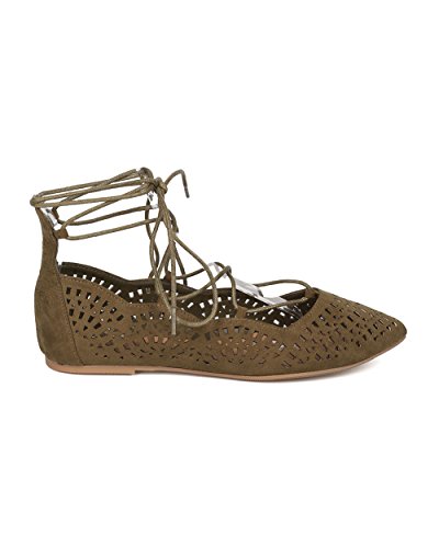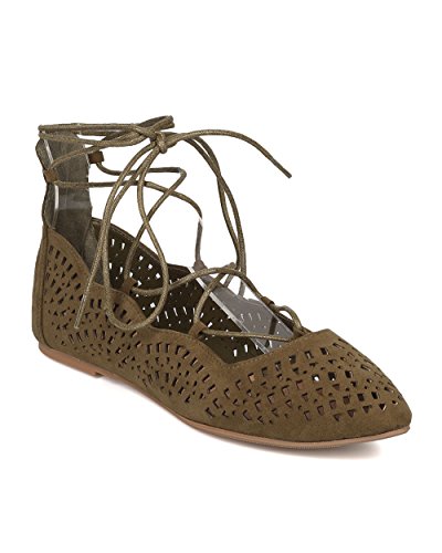 Product Description These faux suede ballet flats are made with a pointy toe, laser cut details and lace up front. Also made with a flat heel and ankle wrap closure. 0