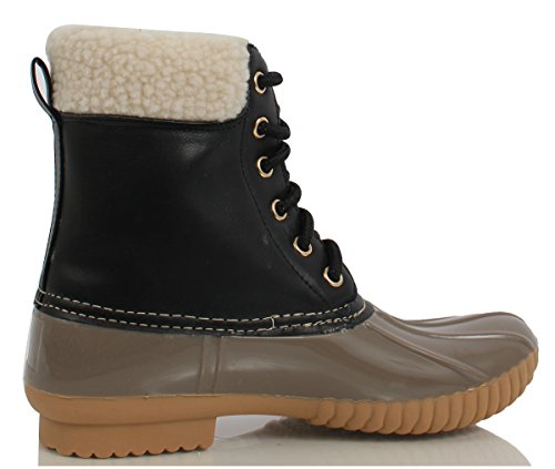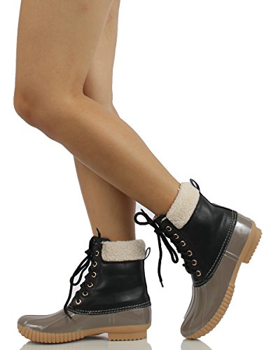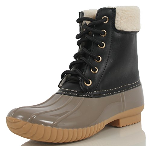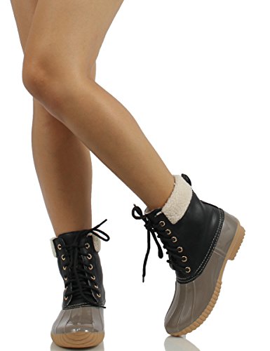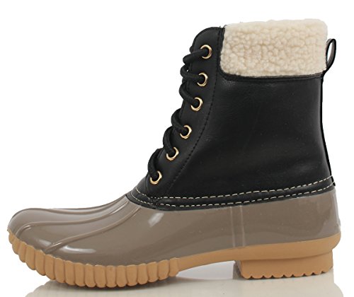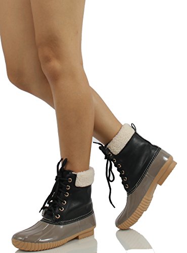 Product Description Cute two tone duck ankle boot featuring lace up closure, faux leather and PVC rubber soles, shearing cuff, and 1" Heel Height. Shaft height including heel 7". Model recommend ordering one size bigger. Ex Model wears size 7 and a size 8 fits her perfectly. 0
