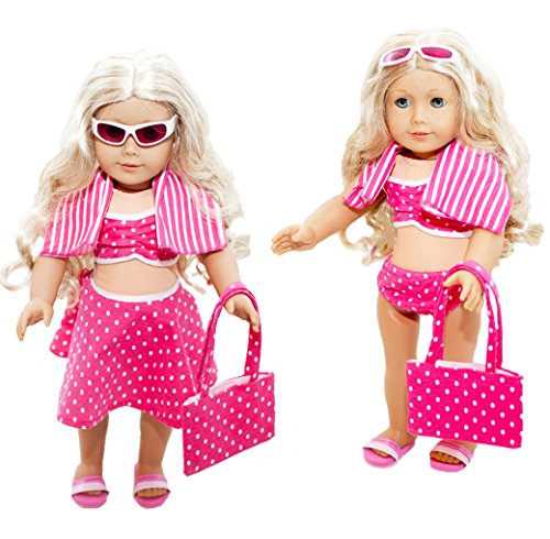 -. Binding : Toy -. Brand : Lilly and the Bee Novelties -. Color : Pink -. Department : toys -. EAN : 0700115649360 -. Feature : Set includes bathing suit, skirt, towel, sunglasses and sandals. / This swimsuit set will fit all 18" dolls. / Swimsuit set is sold exclusively on Amazon / Not affiliated with American Girl official brand. / Doll not included. -. Label : Lilly and the Bee Novelties -. Manufacturer : Lilly and the Bee Novelties -. MPN : RONA-PN-2363514 -. PackageQuantity : 1 -. PartNumber : RONA-PN-2363514 -. ProductGroup : Toy -. ProductTypeName : TOYS_AND_GAMES -. Publisher : Lilly and the Bee Novelties -. Studio : Lilly and the Bee Novelties -. Title : 6 Piece Swimsuit Set for American Girl Dolls: Pretty Pink Polka Dot Swimsuit Set -. UPC : 700115649360