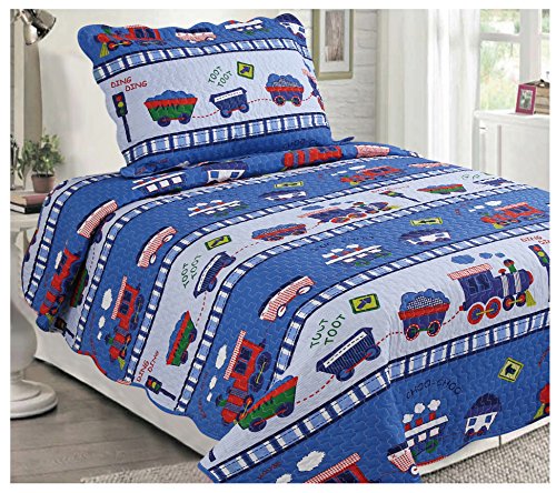 Elegant Home Blue Multicolor Kids Choo Choo Train Cars and Railroad 2 Piece Bedding Quilt Coverlets Bedspread Set Twin Size # 13029