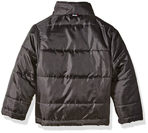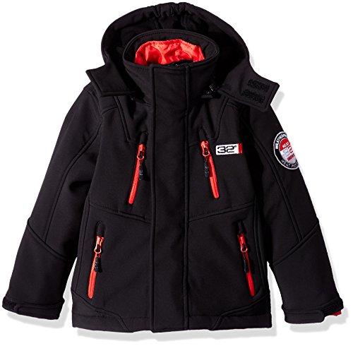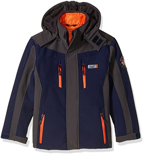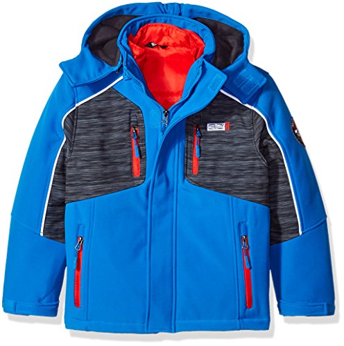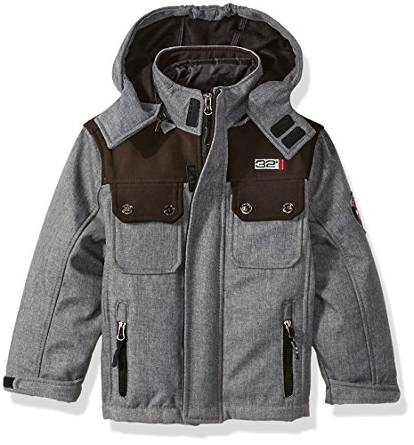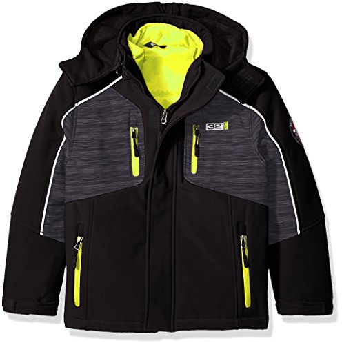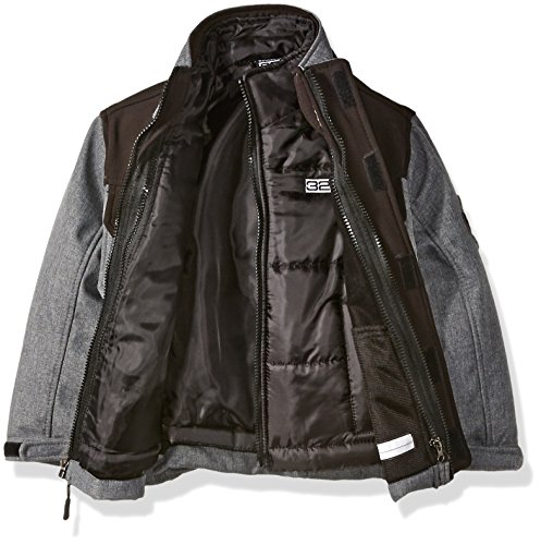 3 in 1 system heather charcoal soft-shell is wind and rain resistant. Solid black yoke. Hooded. Inner mock neck bubble jacketFeature