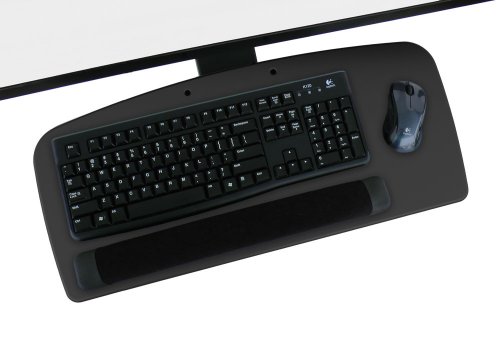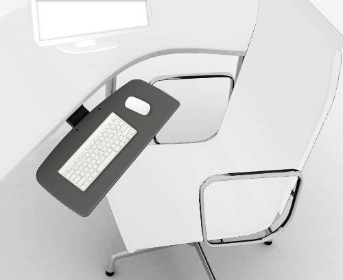 -. Feature : Sturdy and Durable Quality Material - 3/8" mdf core covered and sealed in 3d laminate vinyl / Tray dimensions: 25"W x 11 1/8"D / Glide track: 17 3/4" L / Easy to operate spring assisted arm / Fully Adjustable: Swivel / Height adjustment of 5 1/2" / Tilt range of +/- 15° / Stores under the work surface / Includes FREE wrist rest