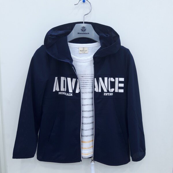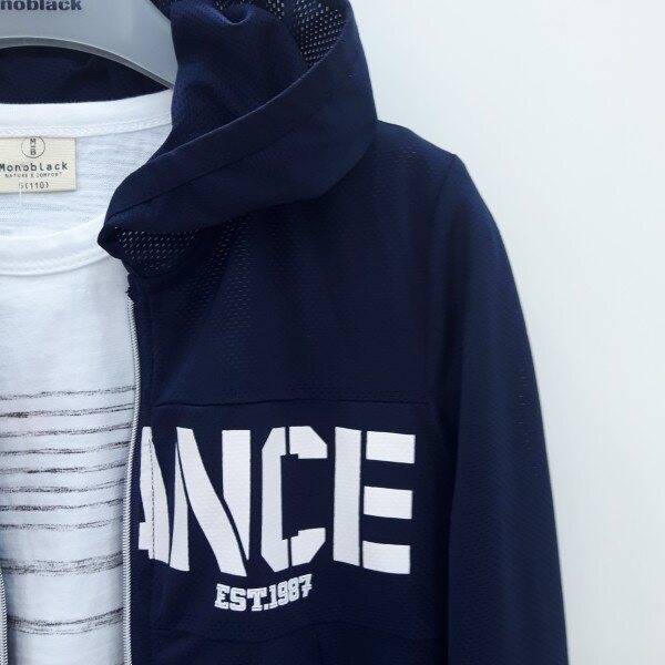 영문 나염으로 포인트를 준 후드 메쉬 점퍼입니다