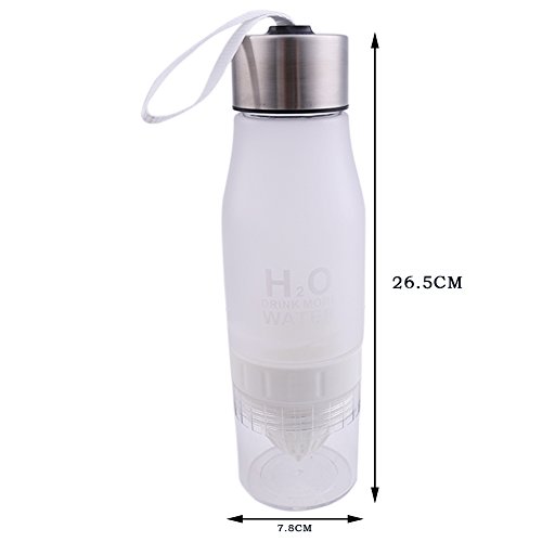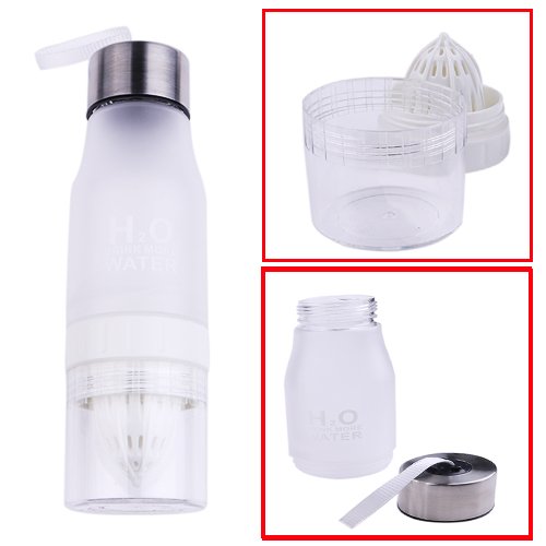 Product specification: Product name:Frosted Fruit Infuser Water Bottle Capacity: 650 ml Color:Blue, White, Black,Red Material: plastic silicone stainless steel Size: 9.6 inch high, 2.8 inch in diameter Stainless steel lid: 1.3 inch high, 2.2 inch in diameter Cup height: 5.6 inch high, diameter of 2.8 inch Juicer: 3.3 inch high, 2.8 inch in diameter Under the cup body: 2.7 inch high, 2.7 inch in diameter