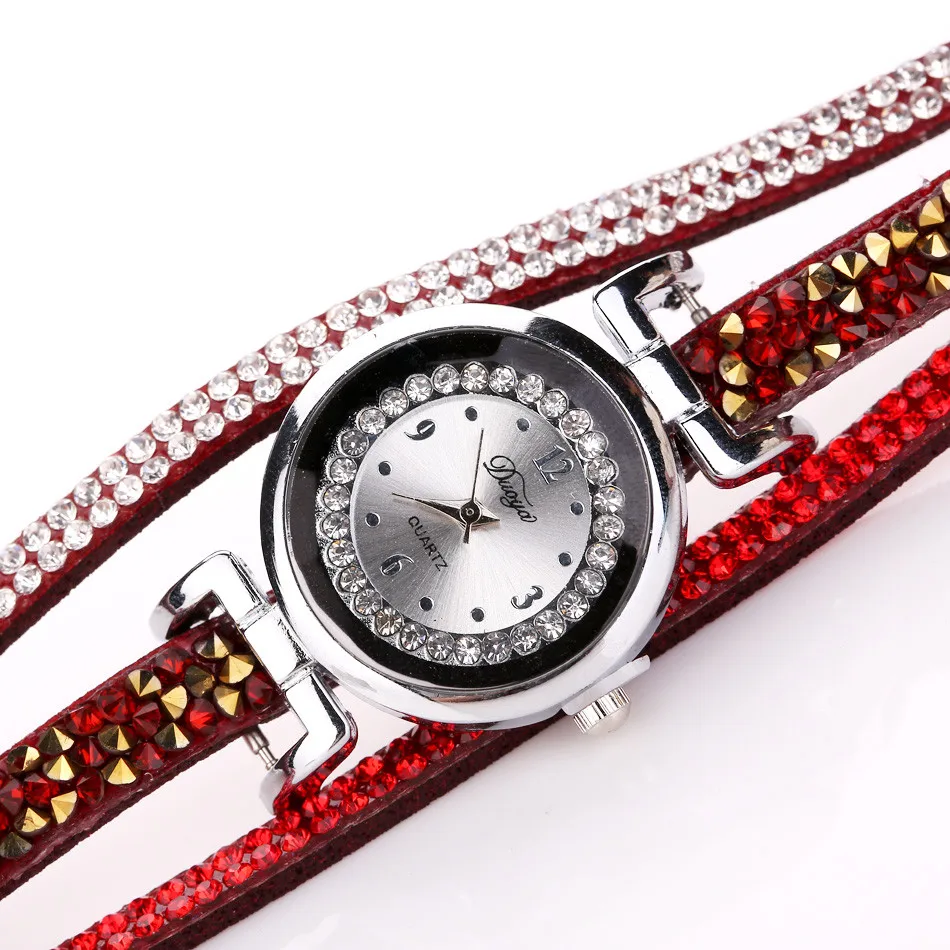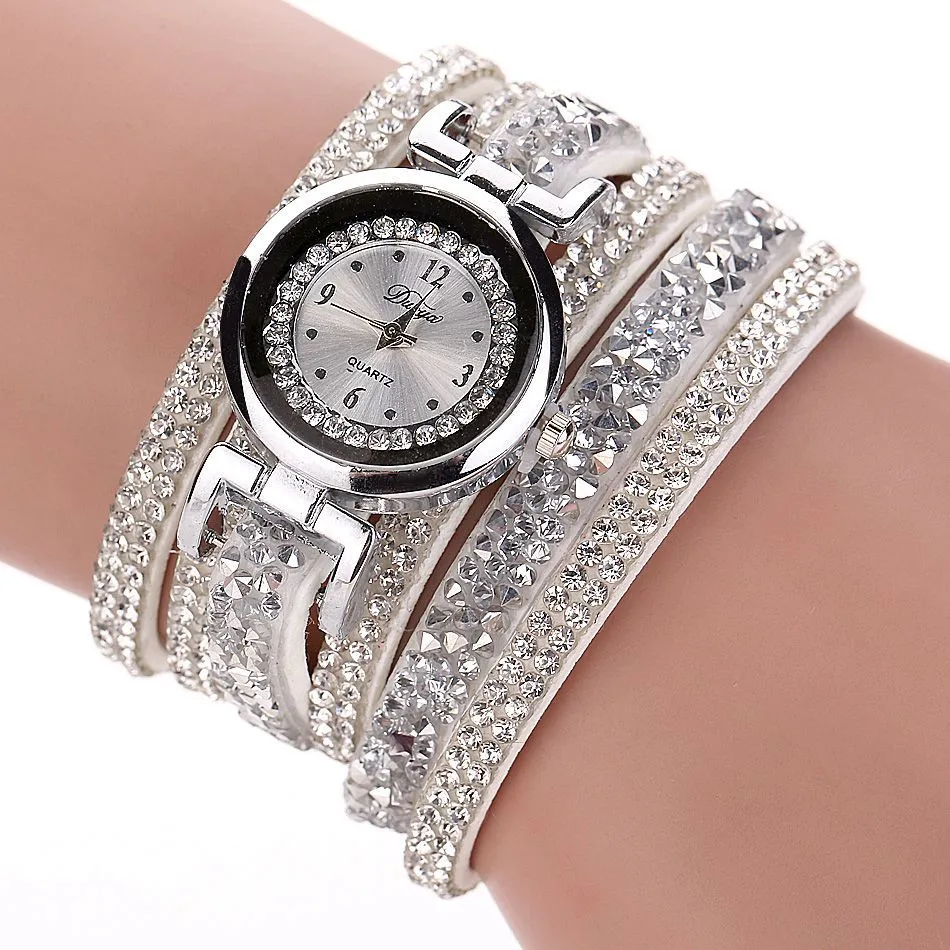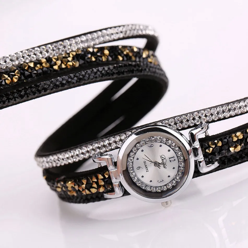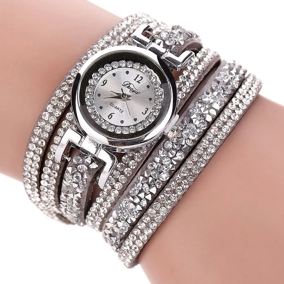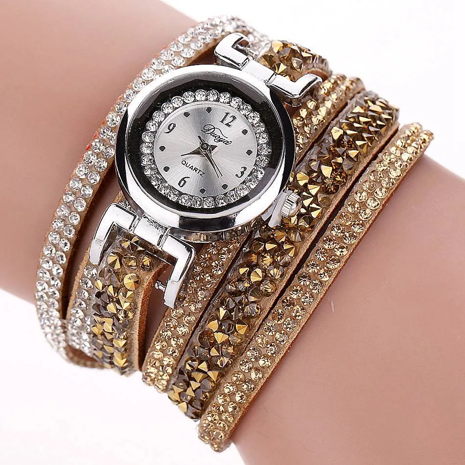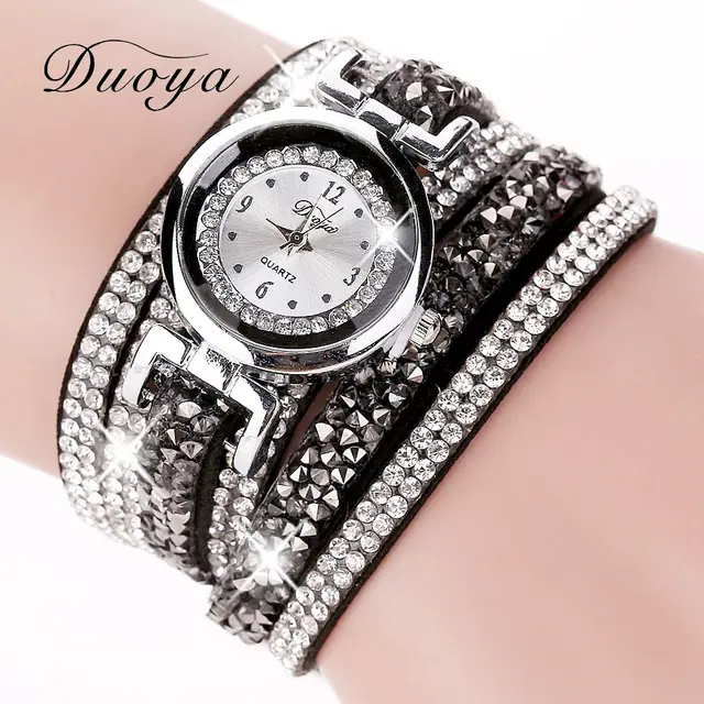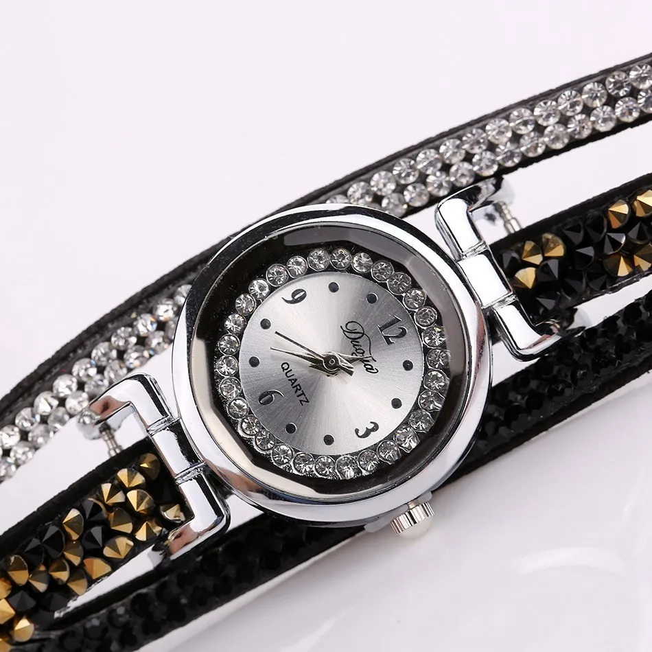 | [해외] Duoya 새로운 골드 숙녀 가죽 유행 실버 팔찌 시계 손목 시계 크리스탈 패션 여성 돌 석영 리벳 시계 |