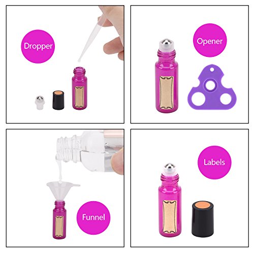 Essential Oil Roller Bottles by Easytle ( 24 Pack Mixed Color Glass Bottle 5ml, 96 Pieces Labels, 2 Opener, 4 Funnels, 4 Dropper) Roller Balls for Essential Oils, Roll on Bottles