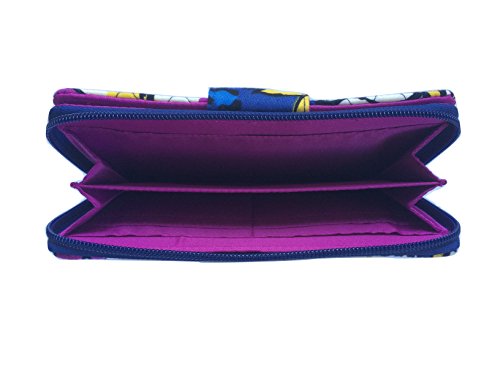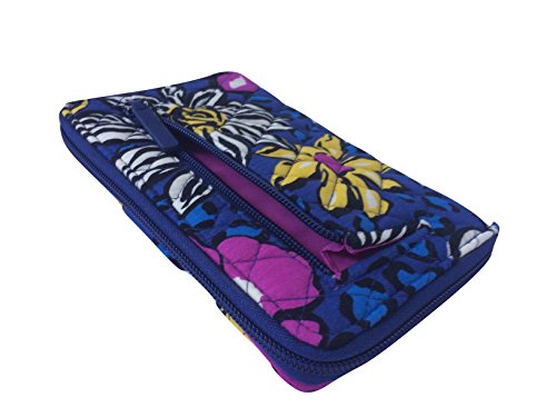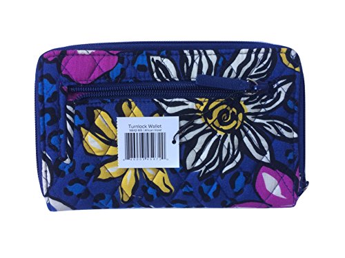 Vera Bradley's spacious Turnlock Wallet is made of soft quilted fabric on the outside with a coordinating solid custom print logo fabric on the interiors. There are two main compartments - a zip around portion features 6 card slots and two full length bill compartments. The tab and turn lock closure portion features another 6 card slots, 2 clear ID slots and a full length bill compartment. The back exterior features a zippered pocket. It measures approximately 7 3/4 inches (L) x 4 3/4 inches (H) x 1 inch (W). The location of pattern varies with each wallet. Spot clean with a damp cloth and mild soap. Patterns with solid color interiors are designed and manufactured for Vera Bradley Outlet stores.Feature