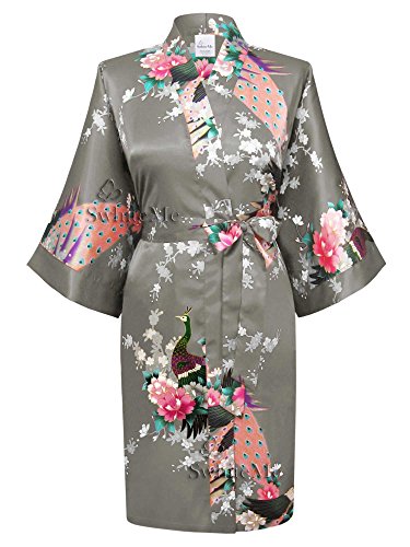 Swhiteme Women's Kimono Robe, Short, One Size, Peacock, Gray, KPS01B