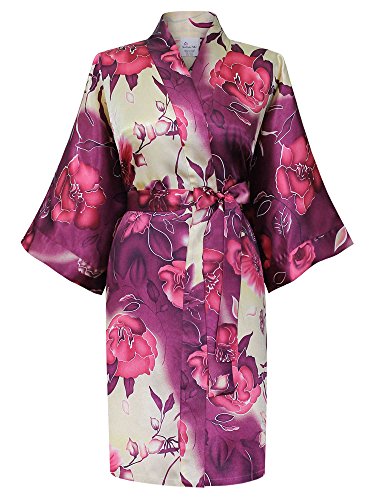Swhiteme Women's Kimono Robe, Short, One Size, Floral, Wine, KPS01
