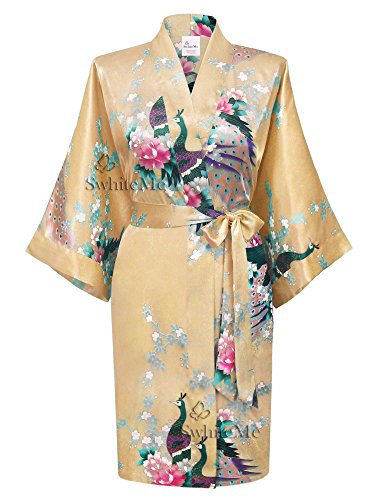 Swhiteme Women's Kimono Robe, Short, One Size, Peacock, Golden Apricot, KPS01B
