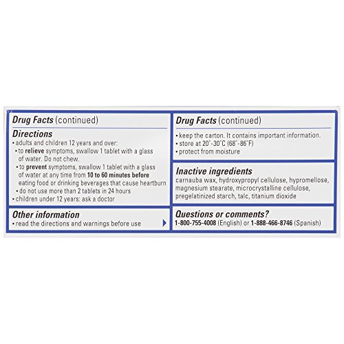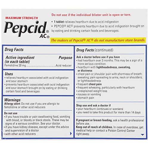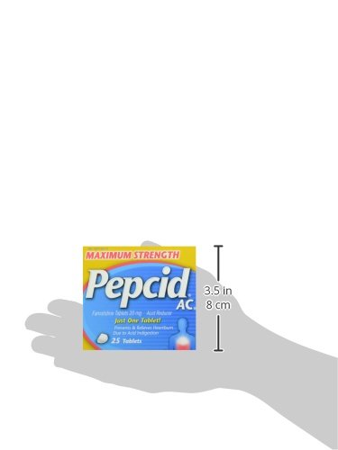 -. Binding : Health and Beauty -. Brand : Pepcid -. EAN : 0716837855255 -. Feature : Can prevent heartburn before it starts* / Maximum strength acid reducer / Works when taken as little as 10 minutes before an evening meal* / 1 tablet controls acid all day or all night** / *Prevents heartburn if taken 10 to 60 minutes before a meal.**Based on 9-hour acid control studies during the day and 12-hour acid control studies during the night. Acid control does not imply symptom relief. -. Label : PEPR7 -. Manufacturer : PEPR7 -. NumberOfItems : 1 -. PackageQuantity : 1 -. ProductGroup : Pantry -. ProductTypeName : HEALTH_PERSONAL_CARE -. Publisher : PEPR7 -. ReleaseDate : 2015-02-10 -. Studio : PEPR7 -. Title : Maximum Strength Pepcid Ac Tablets, 25 Count -. UPC : 716837855255