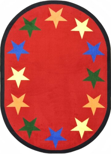 Studio : Joy Carpets Publisher : Joy Carpets Product Description 1458DD Rug Size: Oval 7'8" x 10'9" Features: -StainMaster technology.-Round shape.-Each child can sit on his or her very own star space.-Blue, yellow, green, and orange stars on a red carpet.-Lifetime antistatic, antimicrobial, soil and stain protections.-100% high twist premium nylon.-Technique: Tufted cut pile.-2-Ply heat set yarn.-High fiber density.-Softflex.-Joy tuff rugs.-Made in USA.-CRI Green Label Plus Certified.-SoftFlex Backing. Color/Finish: -Color: Multi. Dimensions: -64': 64' W x 92' D.-92': 92' W x 129' D.-129': 129' W x 160' D.-Oval 64': 64' W x 92' D.-Oval 92': 92' W x 129' D.-Border round: 91' W x 91' D. Warranty: -10 year wear warranty. 0