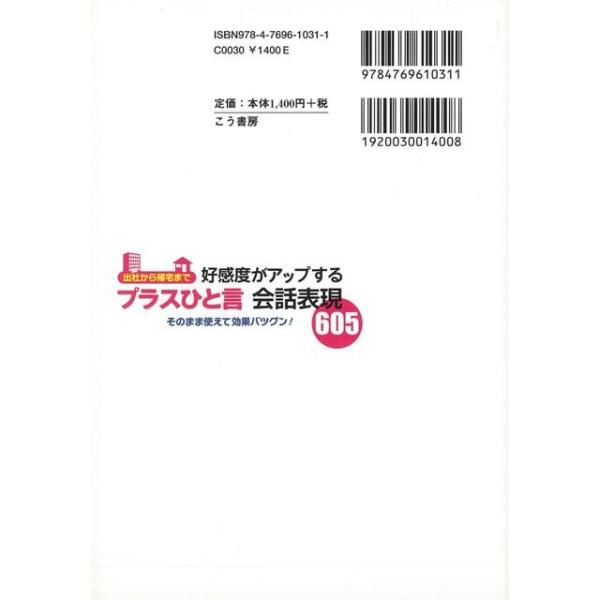 【商品基本情報】 商品名称:出社から帰宅まで好感度がアップするプラスひと言会話表現605 著者/出版社:木村 隆志/木村 隆志 初版発行日:2010/07/10 サイズ:B6判 ページ数:240 ISBN/JAN:9784769610311/4528189367791