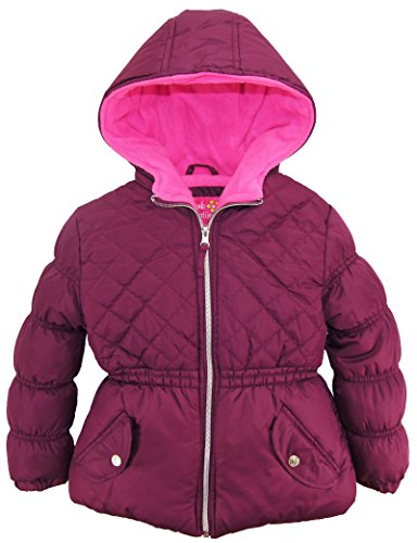 Pink Platinum infant girls solid color quilted snowsuit jacket with black and white heart and snowflake print snow bib