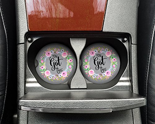 Car Coasters - Absorbent Sandstone - You Got This (SET of 2) - 2.56" x 0.30" Cup Holder Set Inspirational Quote Pink Green Floral Wreath Cute