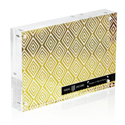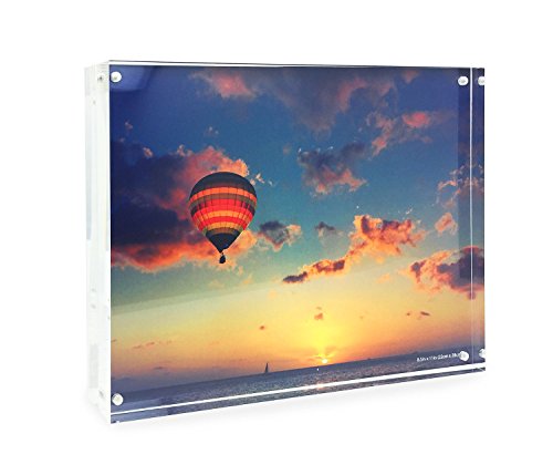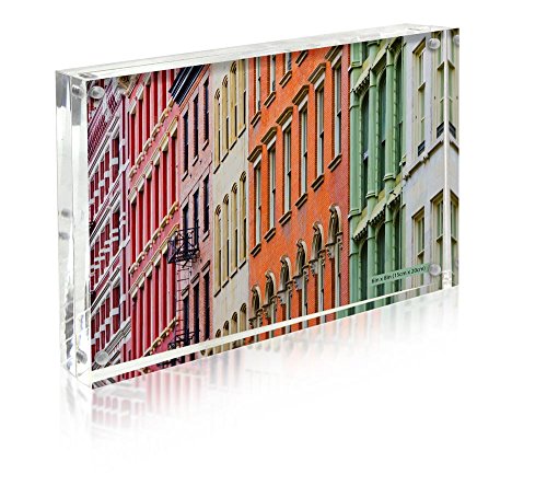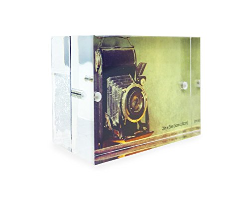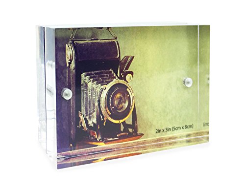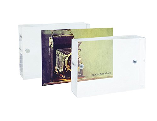 This Isaac Jacobs International block frame is made of a high quality, super-thick, durable acrylic. The two sturdy panels of clear acrylic are held together by small magnets in the 4 corners of the frame. These panels slide off effortlessly, making it easy to place a picture inside. The frame is thick enough to stand on its own and can be displayed either vertically or horizontally. Since the frame is completely transparent it can be used to showcase 2 photos- one on each side. The frame size listed, holds a photo of that exact size; however you can also display a suspended smaller picture to give it a floating look (as well as multiple smaller photos). This multi-purpose frame is versatile and can also be used to hold ticket stubs, magazine clippings, pressed flowers, documents, art, awards, and other mementos, as well as display signs for hotels, restaurants and much more! NOTE: This frame cannot be mounted on a wall