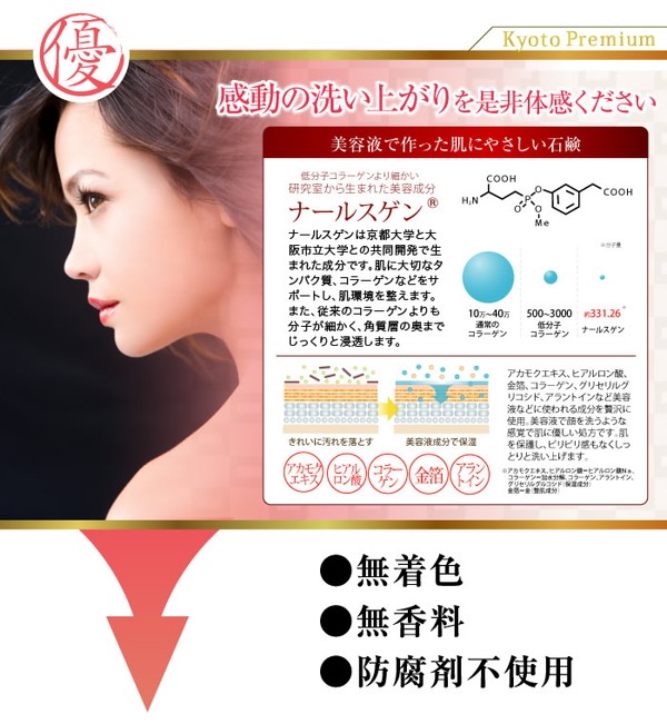 さらに、無着色、無香料、防腐剤不使用で肌に優しい石鹸です。 |