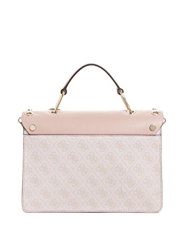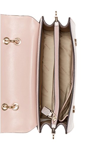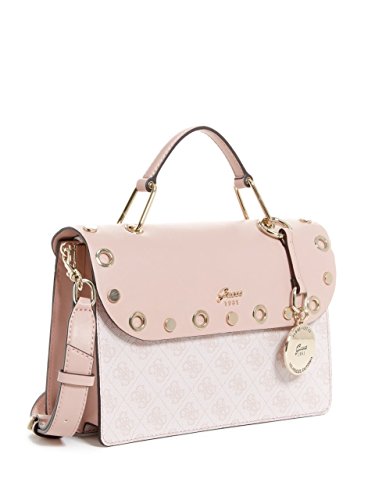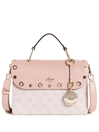 A must-have satchel with faux leather monogram construction and a flap top with edgy grommets and studs. Features snap-button top closures, a top handle and removable shoulder strap. Interior holds multipurpose pockets, along with a center divider and back zipper compartment.Feature