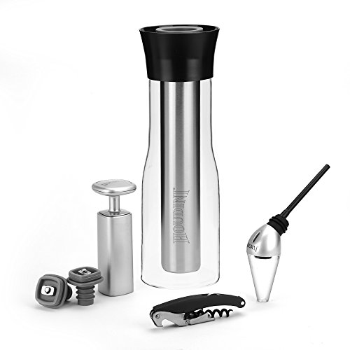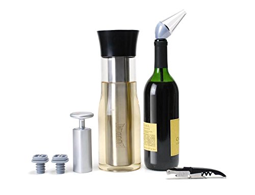 Studio : Metrokane Publisher : Metrokane Binding : Kitchen Product Description The Houdini Wine Tool Kit is the ultimate wine kit, and an incredible value! This kit comes with everything you need to open, serve, and preserve wine. Opening is covered by the included waiters corkscrew. 2-Step Waiter's corkscrew is the type of corkscrew preferred by waiters and sommeliers everywhere. The easy 2-step operation uses the lower level then the upper level if it's needed. Designed with a built in foil cutter to remove foil caps off a bottle, this 2 step corkscrew is easy to carry and ideal for travel. For serving wine, there are two included products for the different types of wine. The chilling carafe is just the thing for white wines, rose, and Zinfandels. These types of wines lose their ideal temperature in just 15 minutes out of the fridge. With the chilling carafe, you can maintain perfect drinking temperature for up to 90 minutes for a pre-chilled bottle out of the fridge. Even more, this carafe will chill a room temperature wine to drinking temperature. The carafe holds a full standard size bottle of wine, and adds a beautiful touch to any serving occasion. For red wines, the silver aerating pourer is a serving maximizer for red wines. Simply attach it to a bottle of red wine, pour into a glass and watch the aeration happen. At the end of the pour, you will notice the enhanced flavor and bouquet of perfectly aerated wine. Lastly, preserving the left over wine couldn't be easier with the included silver preserver. If you don't finish the bottle, save the wine! The preserver is a pump-and-stopper vacuum system that removes air from an opened bottle of wine. This preserves the wine's taste until the bottle is re-opened. The patented Push Button holds the vacuum for days; it is ergonomically designed for easy operation and comes with two stoppers. This is an incredible value as each piece in the set is beautifully made and made with classic Houdini design. For the wine lover, or beginner; the expert or the novice, pick up a kit while you still can! 0