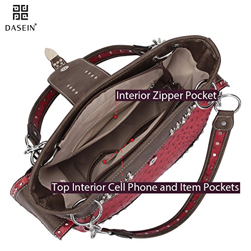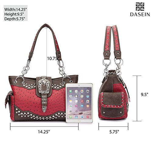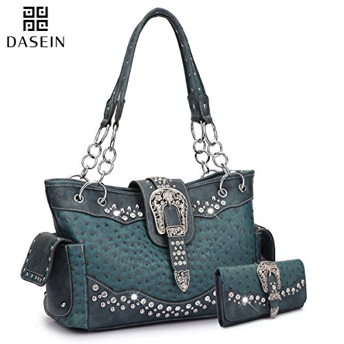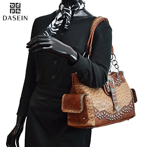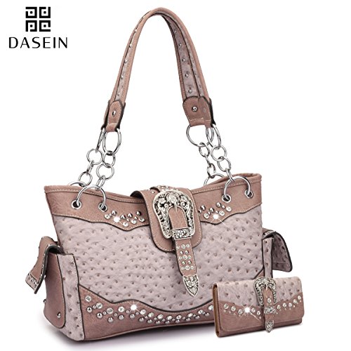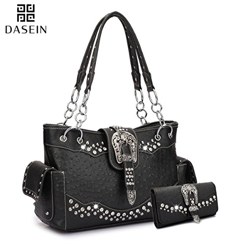 -. Brand : Dasein -. Department : womens -. Feature : ✔Features: Made of high quality Ostrich faux leather or Floral style features with American rhinestone exotic leatherette ostrich, matching silver toned studs and zipper pulls and hardware. / ✔Pockets: 1 Interior Back Wall Zipper Pocket / 2 Interior Open Top Item Pockets / Side Pouch Pockets With Magnetic Snap Closures / ✔Dimensions: 14.25"W x 9.5"H x 5.75"D, Handle Drop Length: 9";✔Closure: Top Zipper Closure and Fold Over Rhinestone Buckle on a Magnetic Snap / ✔The beautiful and exquisite ostrich material detailing lend a Southwestern Flavor of this Rhinestone studded hand bag. With front panel stitching and silver tone studded, side pouches with convenient fold over magnetic snap closures to add style and ease to your day / ✔ 100% NO RISK Money Back Guarantee;✔Ship from Los Angeles;✔FREE Standard Shipping In Contiguous United States;✔Find storefront of Fashlets, more surP.R.Ises are waiting for you! -. PackageQuantity : 1 -. ProductGroup : Shoes -. ProductTypeName : HANDBAG -. Title : Dasein Women's Designer Western Style Rhinestone Belt Buckle Handbag Work Bag Shoulder Bag With Side Pockets
