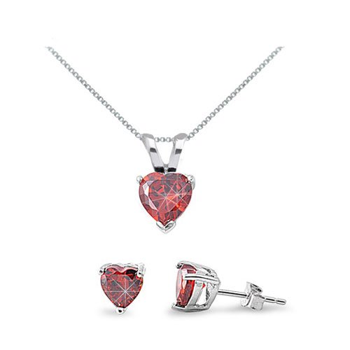 -. Title : Sterling Silver Simulated Red Garnet Heart Necklace & Earrings Set - 16IN to 18IN