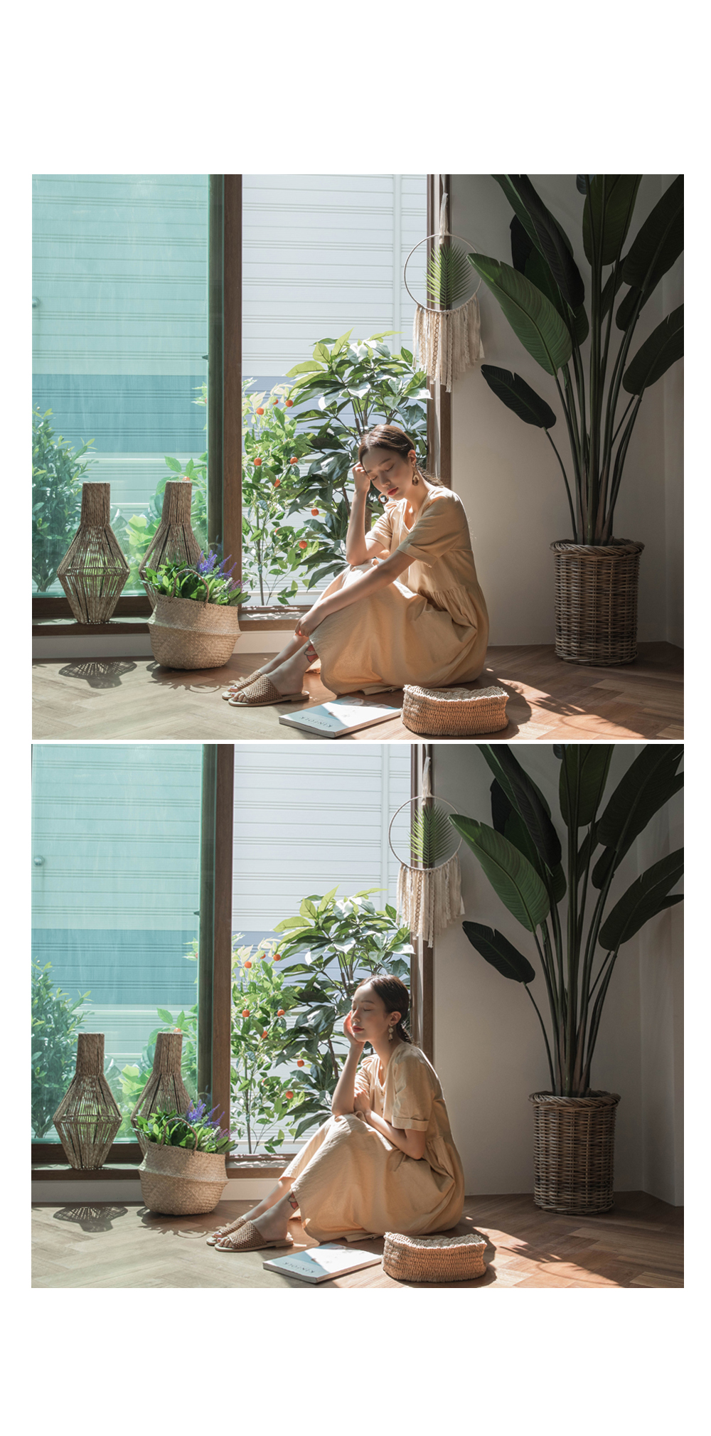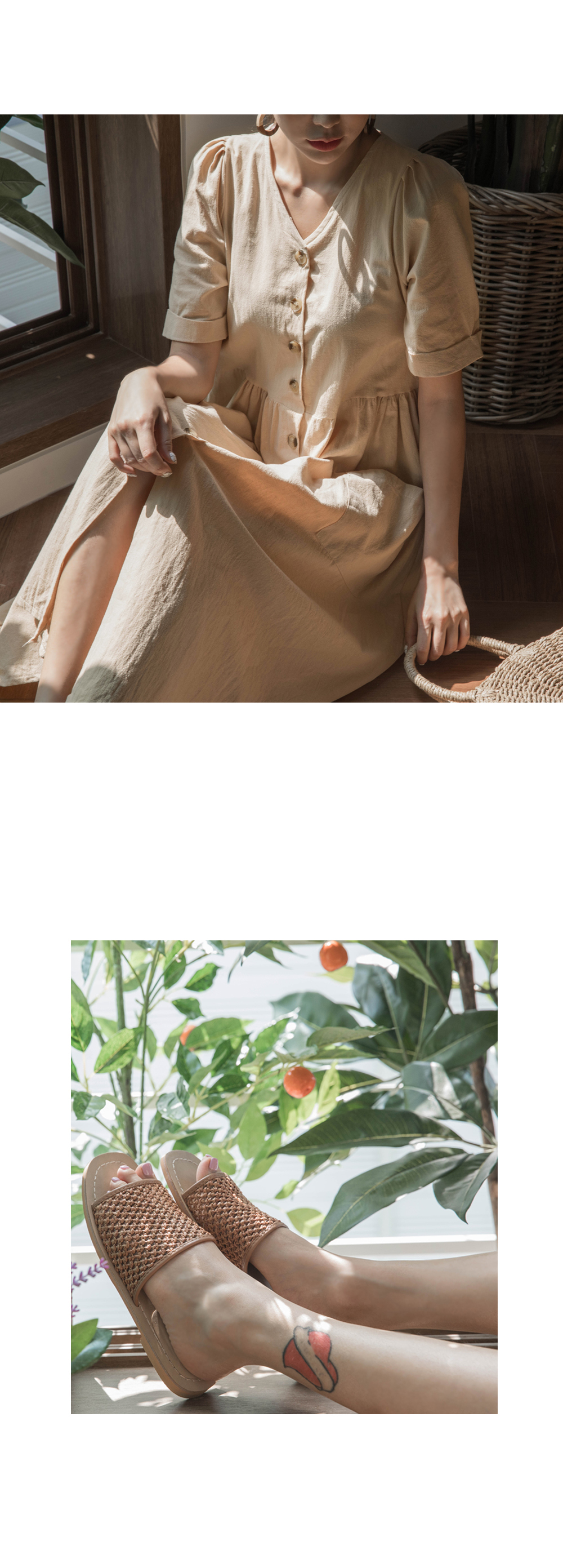 부담스럽지 않은 넥라인과 허리라인에 주름이 포인트를 주고