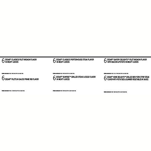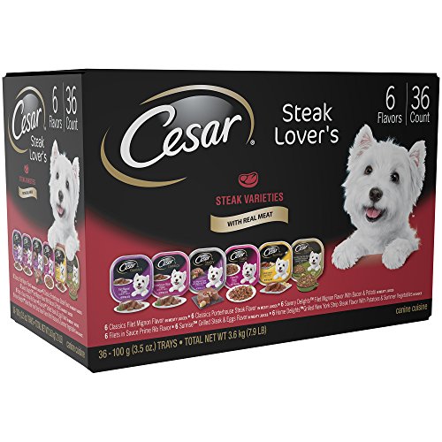 -. Feature : Contains thirty-six (36) 3.5-oz. trays of CESAR Canine Cuisine Classics Fillet Mignon, Porterhouse Steak, Savory Delights Filet Mignon, Filets P.R.Ime Rib, Sunrise Grilled Steak & Eggs, and Home Delights Grilled New York Strip Flavor Wet Dog Food / This gourmet wet food for dogs is served in convenient single-serve trays with easy, peel-away freshness seals / CESAR Canine Cuisine provides complete and balanced nutrition formulated just for adult dogs / This savory dog food is fortified with vitamins and minerals to help dogs of all sizes, especially small breeds, stay healthy