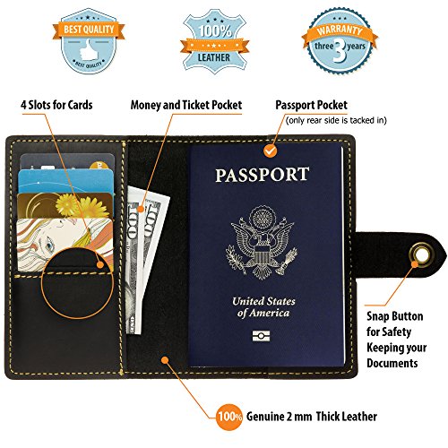 -. Feature : ✔ DIMENSIONS - Villini Passport Holder DIMENSIONS - 5.5 x 4 x 0.35 Inches - US passport fits perfect . And have 4 card pockets and one money pocket . / ✔ SAFETY HOLD YOUR DOCUMENTS - We have seen many passport covers which was always open in your bag that's why we produce snap button as easy way to close the case , for hold tight travel documents . Now our Villini Passport cover holder is durable and proper protection for the document and cards from dust and any unexpected damage. / ✔ 3 YEAR WARRANTY - We are sure of the amazing quality of our pretty product. Although, that our Passport Case made of Impeccable Genuine Leather 1,7mm thick and have 3 Years minimum of the service a life. Many of sales experience have shown that the Passport Cover Holder is exquisite and reliable quality product. / ✔ EXCLUSIVE 3D EMBOSSING - Passport Holder Cover was created by the group of European designers, which are had a task to develop a stylish passport with the USA national symbols and famous seen sights. The creative team had made the decision and presented on the front side of the Passport Holder Case the USA Coat Of Arms and Americans Famous The Brooklyn Bridge, which will always, reminds you in any journey about your country wherever you are . / ✔ FUNKTIONALITY - We always keeping a mind customers asking... about some passport wallet in which they can put all necessary things for happy traveling - Like: Credit cards , money , air tickets, passport. That's why we produce new leather passport holder with pockets for credit and ID cards + money pocket . You have not worry about your passport or credit cards felling out , because we produce the snap button. Now your documents will in safety