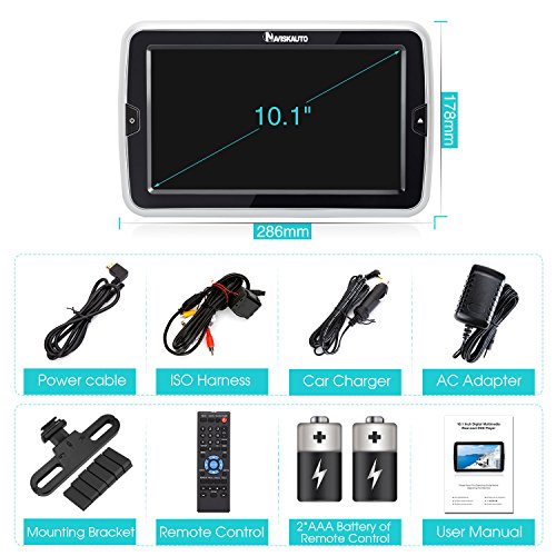 What’s in box: 1*Naviskauto 10.1 Inch Headrest DVD Player, 1*AC Adapter, 1* 12V Car Charger, 1* Power Cable, 1*ISO Harness, 1* IR Remote Control, 2*AAA Battery, 1*Headrest Mount Bracket, 1*User Manual