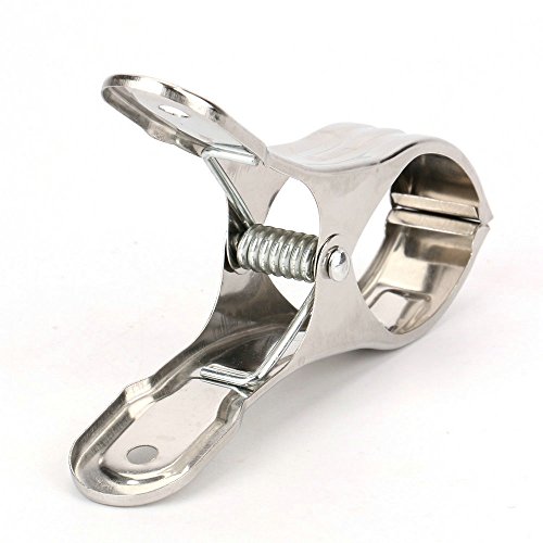 -. Feature : Made of non-magnetic stainless steel - rust resistant, solid and durable, no afraid of exposing in sun or in rain, which is different from the wooden or plastic clips, it is a great convenience for your use indoor or outdoor / Perfect solution: clips secure towel to the frame of most chairs with rounded jaws, the strong clip with good grip keep you towel from blowing away when you sleep in beach or lawn chair / Multi-purpose: it has a big mouth can be open up to 2", firmly holding down your towels, quilt, duvet cover, curtain or cloths on beach lounger/sunbed/clothes hanger and so on, wide enough for various thicknesses household items / Specification: large clip size in 4.5"x 0.9"x 2.5", perfect dimension and light weight, easy to storage or carry out, simply clip them on or toss them in your tote bag / Features: 1.flat mouth design, no catches or snags to your clothing; 2.suitable tail arc fit for human finger, open easily and labor save, children can also to use without difficulty; 3. 6 packs super bag in high quality with affordable P.R.Ice, perfect for home/travel