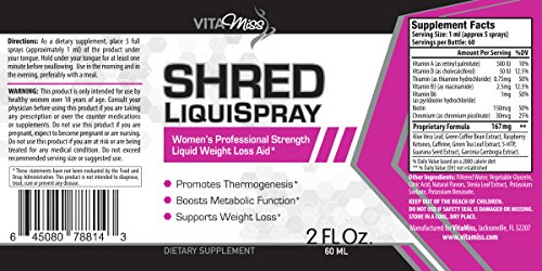 -. Binding : Health and Beauty -. Brand : VitaMiss -. EAN : 0645080788143 -. Feature : Advanced Weight Loss Diet Liquid- Vitamiss's Shred Sunblingual is a critical component to any successful diet and fitness plan. Increases caloric consumption, lowers fat absorption, increases energy, focus, and commitment. / Specially formulated to fight the cravings associated with dieting, suppresses appetite and keeps you fuller longer. / Targets those stubborn fat deposits on problem areas by increasing Thermogenesis and suppressing appetite. / Extremely potent and effective Thermogenic Fat Burner - ProP.R.Ietary formula specially crafted to ignite your metabolism, enhance your muscle tone and definition, and increase your energy levels, focus, and overall mood. / All Vitamiss products are manufactured in the USA, adhering to the highest standards of FDA and GMP compliance. 100% Satisfaction Guaranteed. Vitamiss stands behind each and every product we make, with a FULL money back guarantee at any time, for any reason! -. IsAdultProduct : 0 -. Label : VitaMiss -. Manufacturer : VitaMiss -. MPN : VM18 -. PackageQuantity : 1 -. PartNumber : VM18 -. ProductGroup : Health and Beauty -. ProductTypeName : HEALTH_PERSONAL_CARE -. Publisher : VitaMiss -. Studio : VitaMiss -. Title : Vitamiss Shred Liquispray - Maximum Strength Sublingual Liquid Fat Burner Supplement for Women- Shred Weight Fast While Increasing Energy and Mental Focus! -. UPC : 645080788143