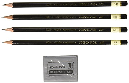 -. Feature : Made from the finest Hardtmuth Graphite / Feature opacity and are clean erasing / Wide range of hardnesses / For dramatic effects in illustrations - drawings - sketches / Set of 4 pencils and 1 eraser