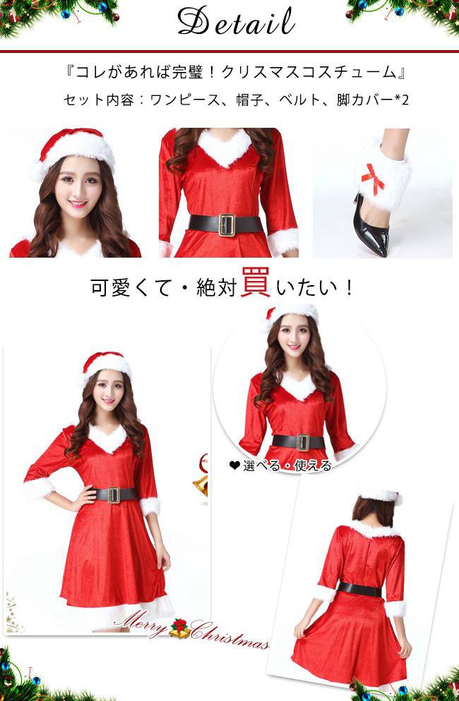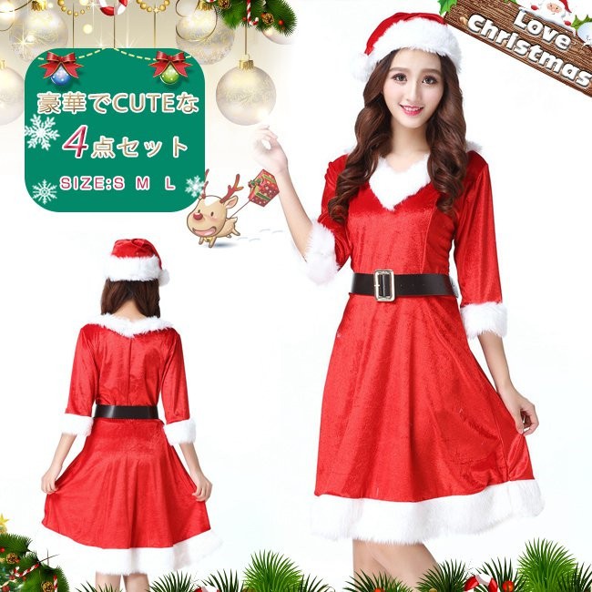 サンタ コスプレ レディース クリスマス 衣装 七分袖 vネック フェイクファー aライン ワンピース 帽子 コスチューム かわいい サンタクロース 仮装 変装 大人 服 セットアップ サンタコス パーティーグッズ イベント用品 余興 xmas Christmas cos 女性用