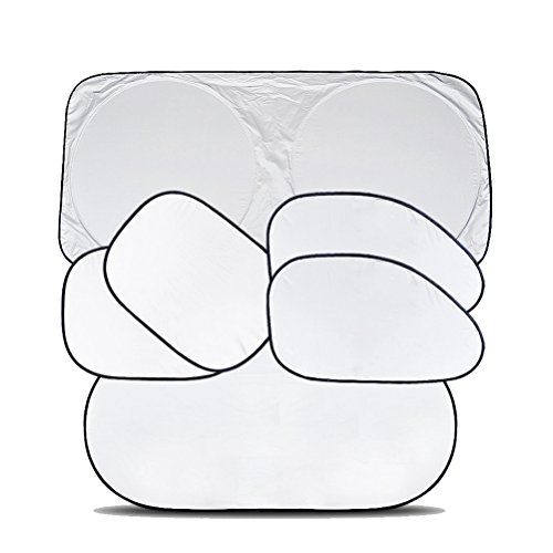 -. Feature : Material: Silver-coated fabric,Metal ; Color:black+ Silver Tone / Easy to install and remove, foldable / Car Sun Shield attaches instantly through suction cups and fold up easily for storage. / Suitable for: Side,Front and Rear Windshield / Package: 1x Front Sunshade 1x Rear Sunshade, 4x Side Sunshade, 12x Suction Cups, 1x Bag