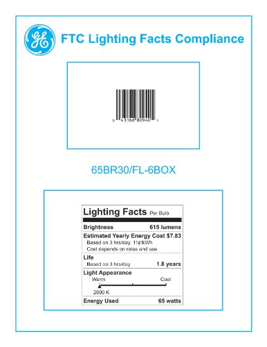 Studio : GE Lighting Publisher : GE Lighting Binding : Tools Home Improvement Product Description GE 80940 65-Watt 615-Lumen R30 Indoor Reflector Light Bulb, Soft White, 6-Pack. 65-watt R30 Incandescent lamp sustains a life up to 1.8 years. Soft White bulb with color temperature rating of 2600 K. Provides approximately 615-lumens of light, illuminating your environment around you. Works with most 120-volt lighting fixtures, light is well suited for Track and Recessed applications. 65-watt Incandescent lamp provides about 2000-hours of running life, which means replacing your bulbs less often. Manufacturer Code Description: 65BR30/FL-6BOX. 0