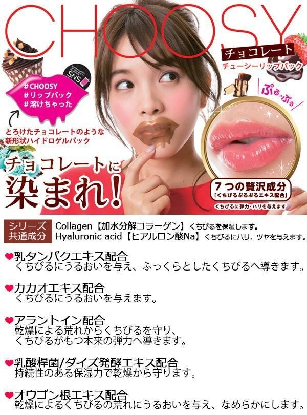 CHOOSYシリーズから、チョコレートシリーズの登場です♪とろけたチョコレートをイメージした新形状リップパック♪柔らかい素材だからどんなくちびるでもしっかり密着!!とってもかわいくて、写真映えもするので、SNSでも盛り上がること間違いなし♪ |