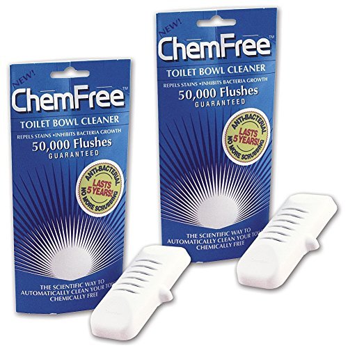 -. Feature : Safe and sanitary toilet bowl cleaner is guaranteed to keep your toilet clean through 50,000 flushes without scrubbing! / Just drop the Chem-FreeTM cartridge into the toilet tank to prevent mineral particles from forming stains and those hard-to-remove rings around the bowl. / Prevents fungus and mildew build-up, while inhibiting bacteria growth. / Safe for children, pets, septic systems, and the environment. / About 6" long.