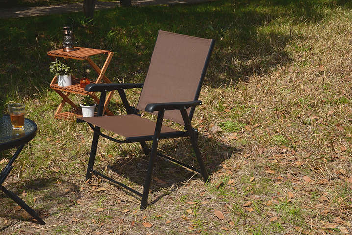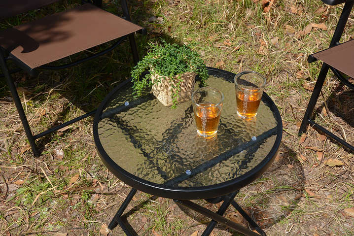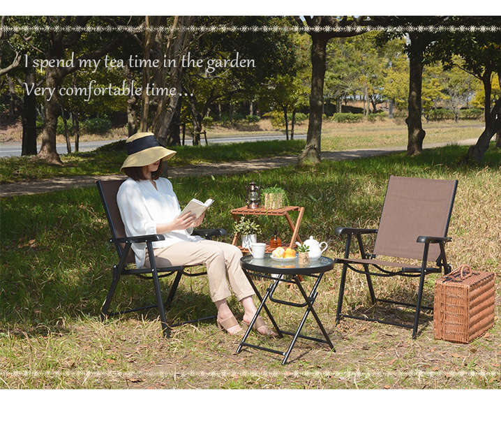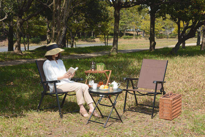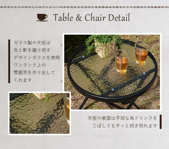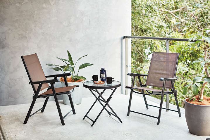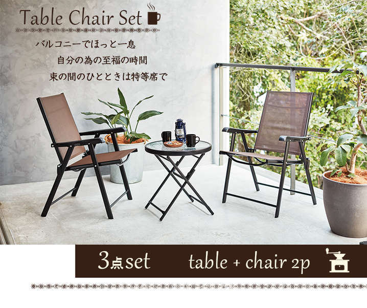●ガーデンチェア2点とガーデンテーブルの3点セット。折りたたみ式でシーズンオフの片付けにも困りません