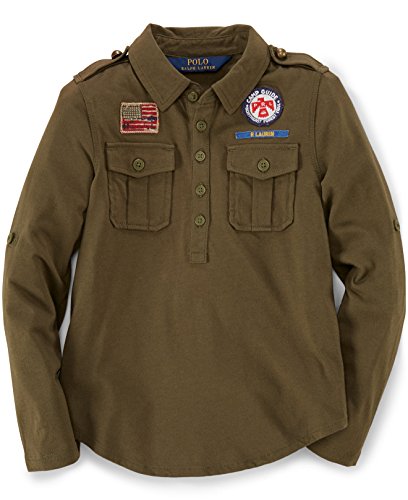Roll up the sleeves on this cargo-inspired top with allover sporty patches for a cool and campy look. Point collar Five-button placket Buttoned shoulder epaulets Long sleeves with cuffs that can be rolled to the elbows and secured with buttoned tabs Flag patch at the right chest "Camp Guide" and "R. Lauren" patch at the left chest Cotton/modal Machine washable Imported