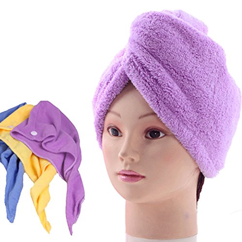 Studio : YUNGUI Publisher : YUNGUI Binding : Misc. Product Description 3Pack Dry Hair Towels,YUNGU Fast Drying Absorbent Microfiber Hair Turban Wrap Quick Magic Dryer Shower Hat with Buttons for Bath Spa Specification: Color: Rose Red Blue Material: Coral Fleece (Microfiber) Measure: 24.8" x 11.8" (64 x 30 cm) Applicable People: Women / Men / Teen Machine Washable: Yes Secure Button: Yes Washing Tip: NO softener, bleaching or dry cleaning Package including: 1 x Pack Hair Drying Towel Orange 1 x Pack Hair Drying Towel Blue 1 x Pack Hair Drying Towel Purple How to use? (3?Steps) 1. Bend to make your hair hang down, put hair towel on your head (the end with button); 2. Wrap your hair with the hanging part of the towel; 3.?Pull up the secure loop across your head and fix it under the secure button. 0
