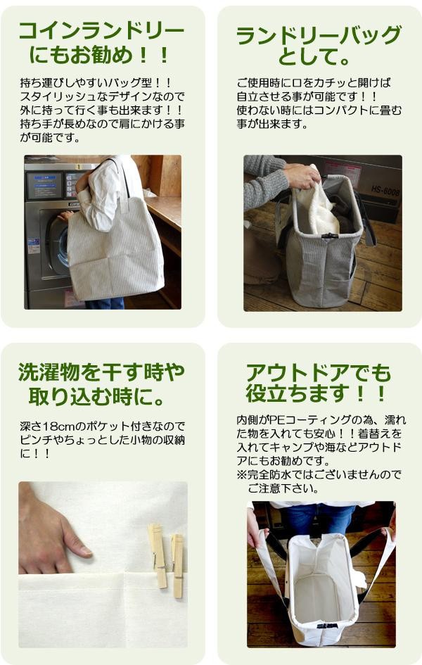 内側がPEコーティングされているので濡れた物を入れても安心!!洗濯物を干す時や取り込む時には勿論、スタイリッシュなデザインなのでコインランドリーに行く時やキャンプや海などアウトドアにもお勧めです♪ご使用時に口をカチッと開けば自立させる事が可能!!使わない時はコンパクトに畳んでおけます。※完全防水ではございませんのでご注意下さい。 |
