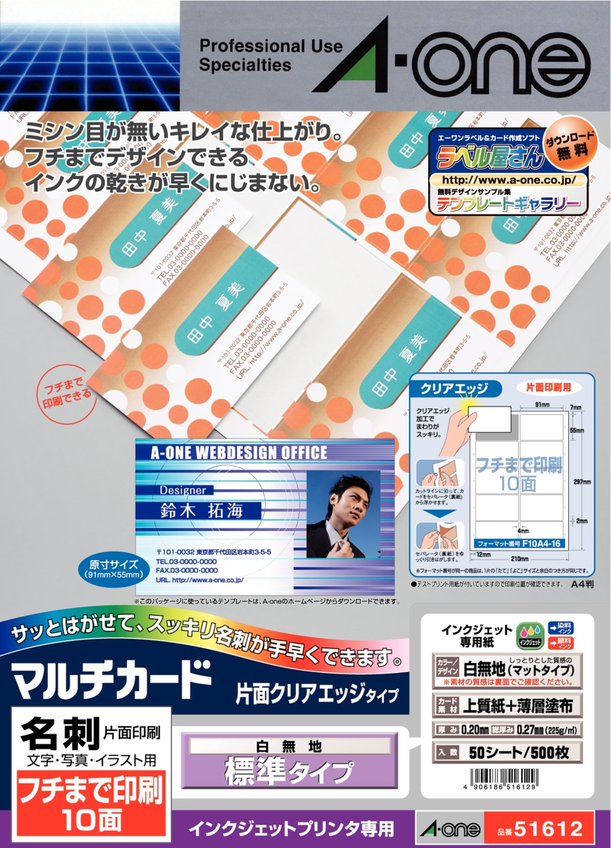 -One to (A-one) multi-card inkjet printer special paper clear edge type plain white A4 size borderless printing 10 business card size 50 face sheet (500 sheets) 51 612 (japan import)